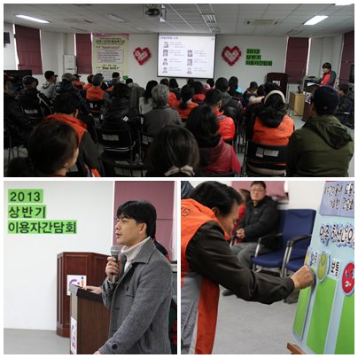 2013³âµµ »ó¹Ý±â ÀÌ¿ëÀÚ °£´ãȸ¸¦ Áö³ 5ÀÏ(È)¿¡ ÁøÇàÇÏ¿´½À´Ï´Ù.2013³â¿¡ ÁøÇàµÇ´Â º¹Áö°ü »ç¾÷ ¼Ò°³¿Í ¼ÅƲ¹ö½º, Á÷¿ø µî º¯°æ»çÇ× ¾È³», ½Å±ÔÁ÷¿ø Àλç, ÀÌ¿ëÀÚ¿ÍÀÇ ´ëÈÀÇ ¼øÀ¸·Î ÁøÇàÇÏ¿´½À´Ï´Ù.¸¹Àº ºÐµéÀÌ Âü¼®ÇϽþî ÁÁÀº ÀǰßÀ» Áּż °¨»çÇÕ´Ï´Ù.¾ÕÀ¸·Îµµ ´õ¿í ÁÁÀº ¸ð½ÀÀ¸·Î ã¾ÆºË°Ú½À´Ï´Ù^^